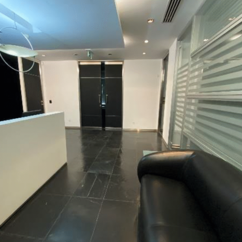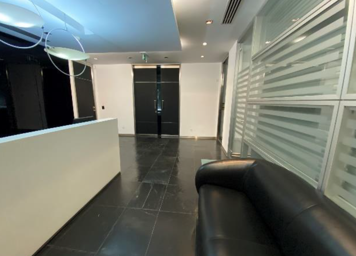 This modern commercial building is located on a main commercial street in Aglantzia, Nicosia, and consists of two basement levels, a ground floor with mezzanine, and four upper floors. The second basement is leased for five years to the current tenant for telecommunication equipment, while the first basement serves as parking.