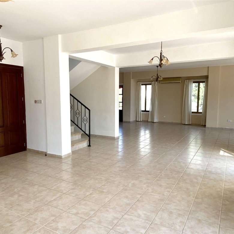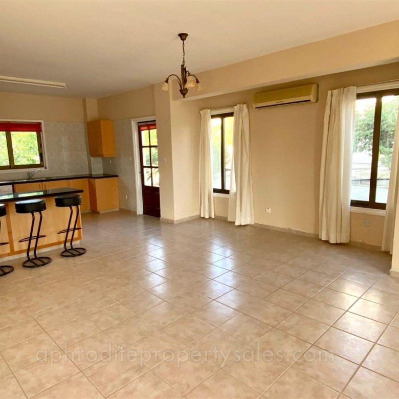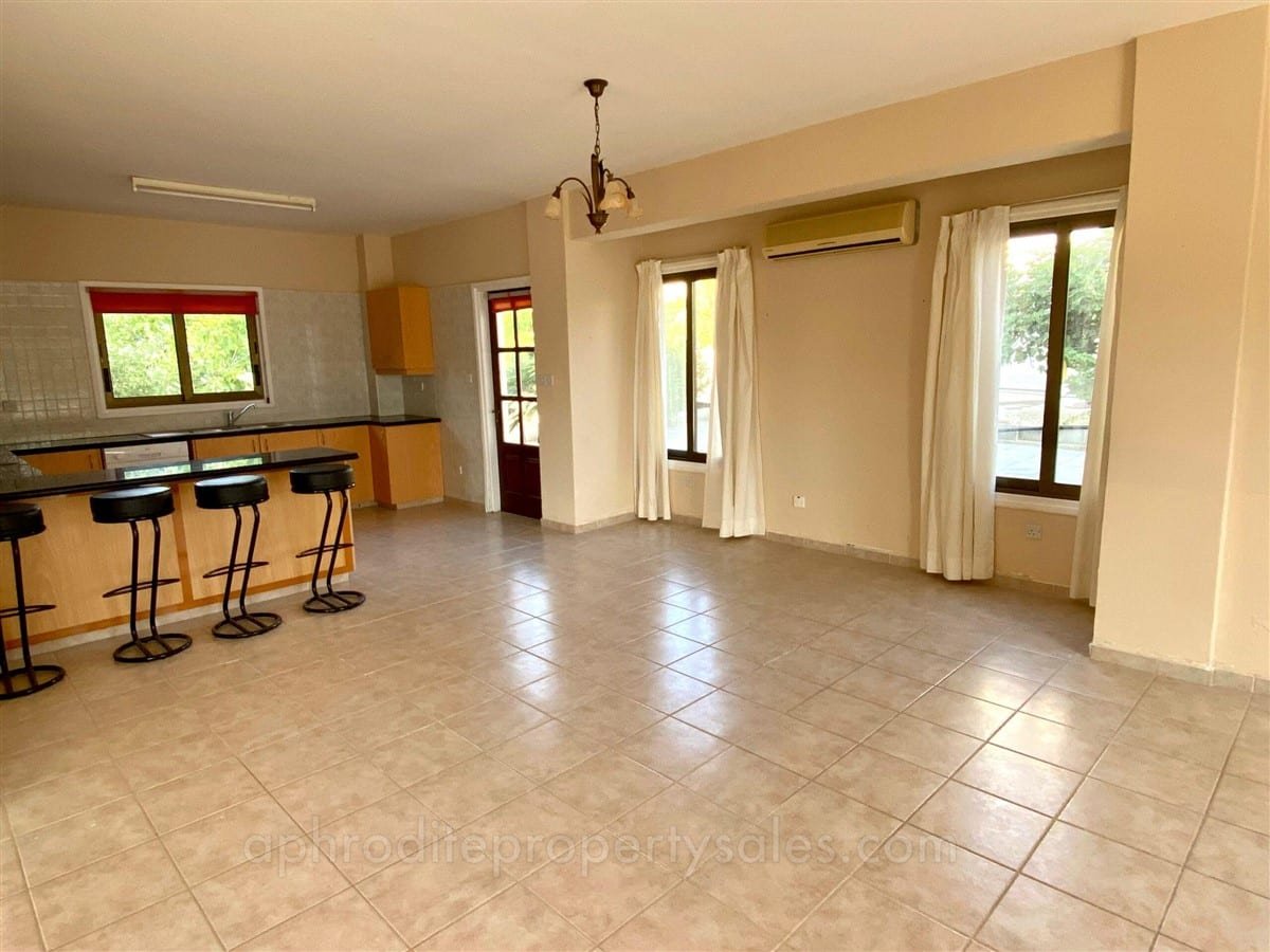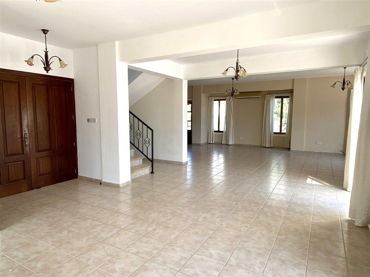 Set back from the road, the property features a generously sized driveway with open garaging. Upon entering through double doors, you are greeted by a triple-aspect reception room with ample dining space and an open-plan kitchen in generally good condition. The ground floor also includes a guest toilet. Multiple sliding casement doors provide access to the pool terrace and the 10×5 meter pool, which is scheduled for refurbishment. Beyond the pool lies an orchard with fruit trees, leading to the green zone behind the neighborhood villas.
