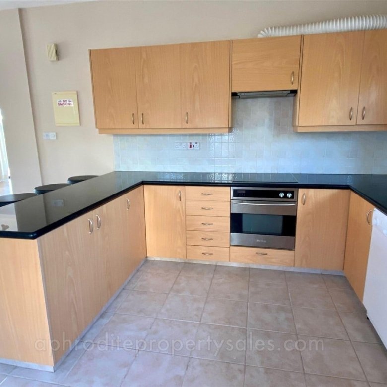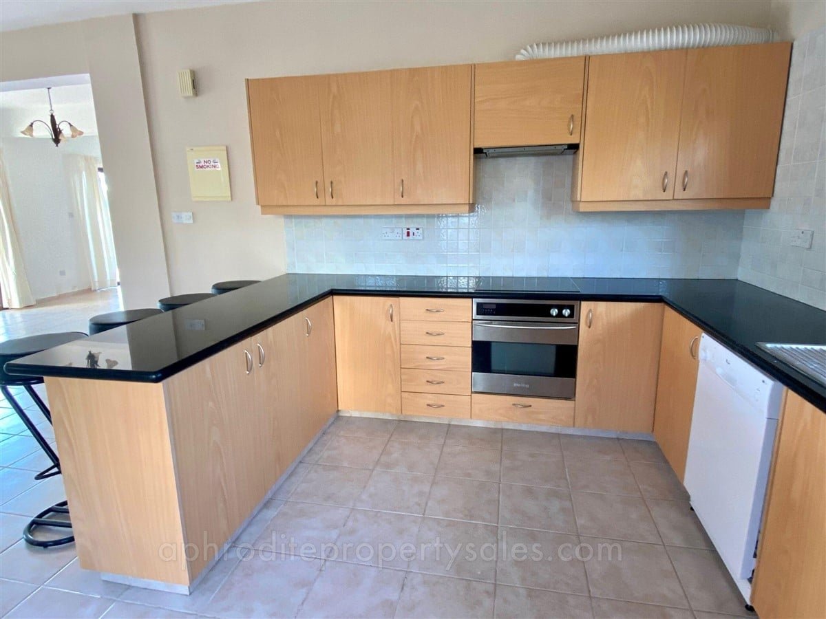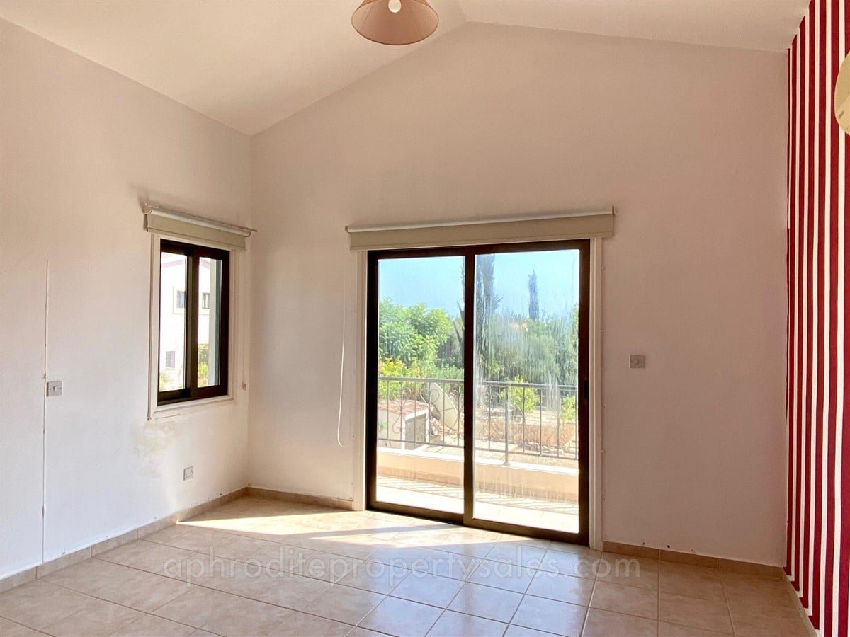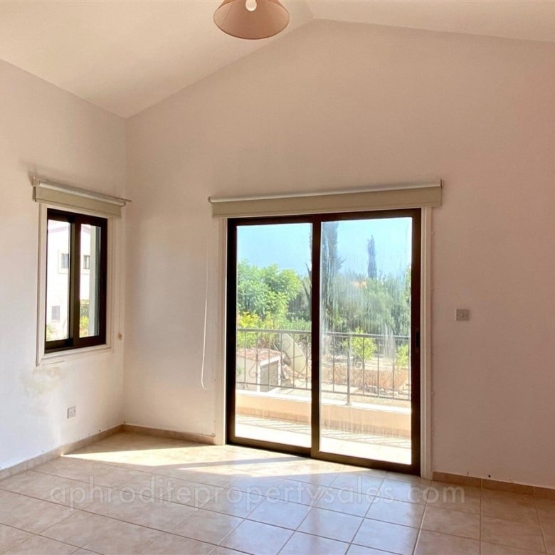 Set back from the road, the property features a generously sized driveway with open garaging. Upon entering through double doors, you are greeted by a triple-aspect reception room with ample dining space and an open-plan kitchen in generally good condition. The ground floor also includes a guest toilet. Multiple sliding casement doors provide access to the pool terrace and the 10×5 meter pool, which is scheduled for refurbishment. Beyond the pool lies an orchard with fruit trees, leading to the green zone behind the neighborhood villas.