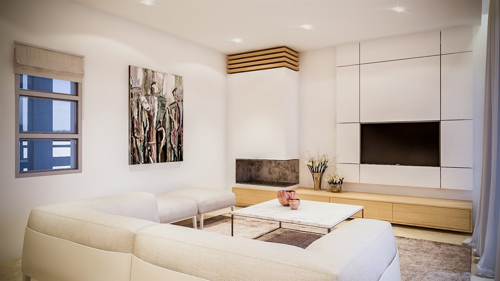 The open-plan layout, light-colored finishes and elegant furnishings create a fresh, airy feel.