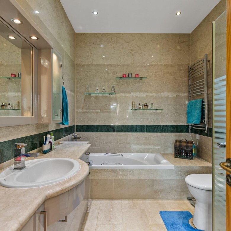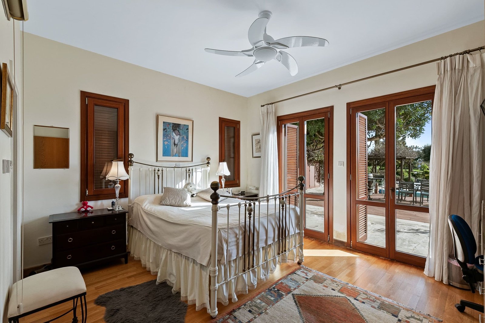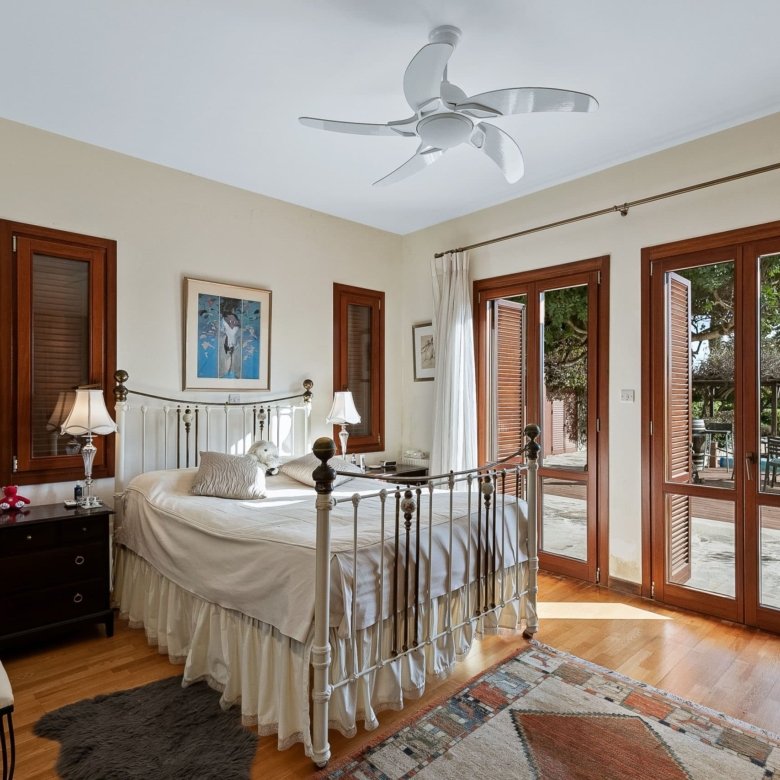 The master suite includes a walk-in dressing room and an en-suite bathroom, with direct access to the pool terrace. The second bedroom has an en-suite shower room, while the third and fourth bedrooms are located via a marble staircase. The fourth bedroom is ideal for a nanny or housekeeper, as it has a separate entrance. Outside, the villa features a raised terrace, a private pool, a pergola, a garden shed, and a variety of fruit trees leading down to the golf fairway.