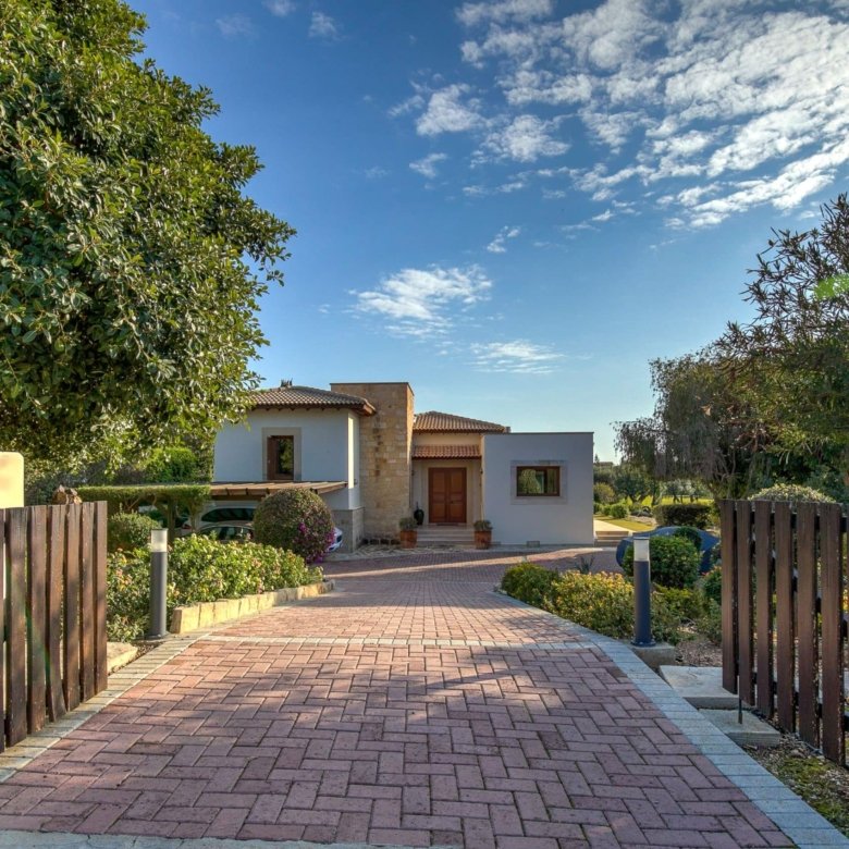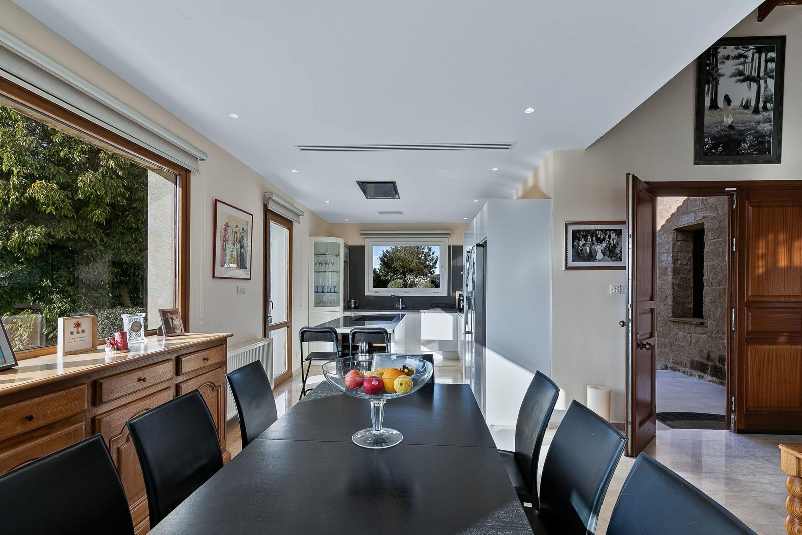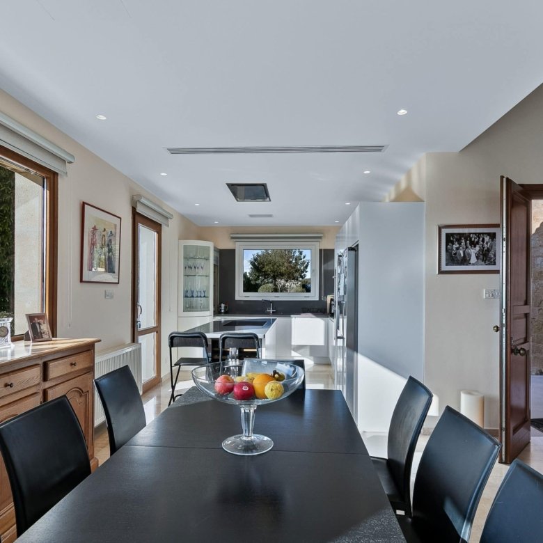 This stunning 4-bedroom front-line golf villa offers spectacular panoramic views in every direction, located just a 10-15 minute walk from the amenities of Aphrodite Hills Golf Resort in Paphos. Inside, the spacious open-plan living and dining area features vaulted wooden ceilings and garden views overlooking the golf course. A large covered conservatory enhances the living space, while the kitchen is equipped with a central island and integrated appliances.