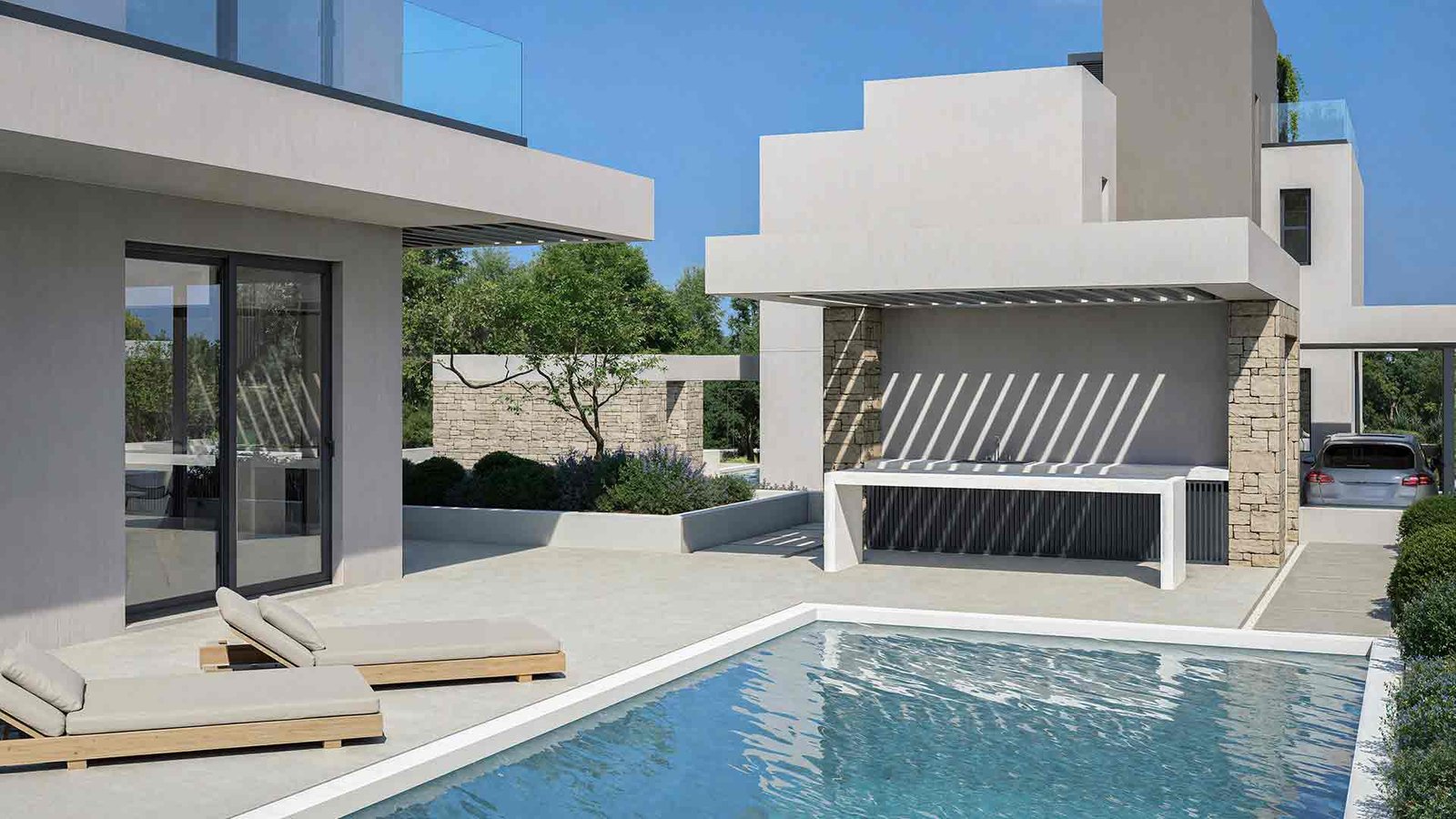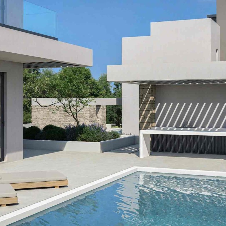 This modern 4-bedroom house is located in the Lower Chloraka area of Paphos, close to pristine beaches, local amenities, Kings Avenue Mall, and a variety of restaurants, cafés, and bars. The complex features four villas. Each villa consists of 4 bedrooms and 4 bathrooms and includes a landscaped garden and a private swimming pool.