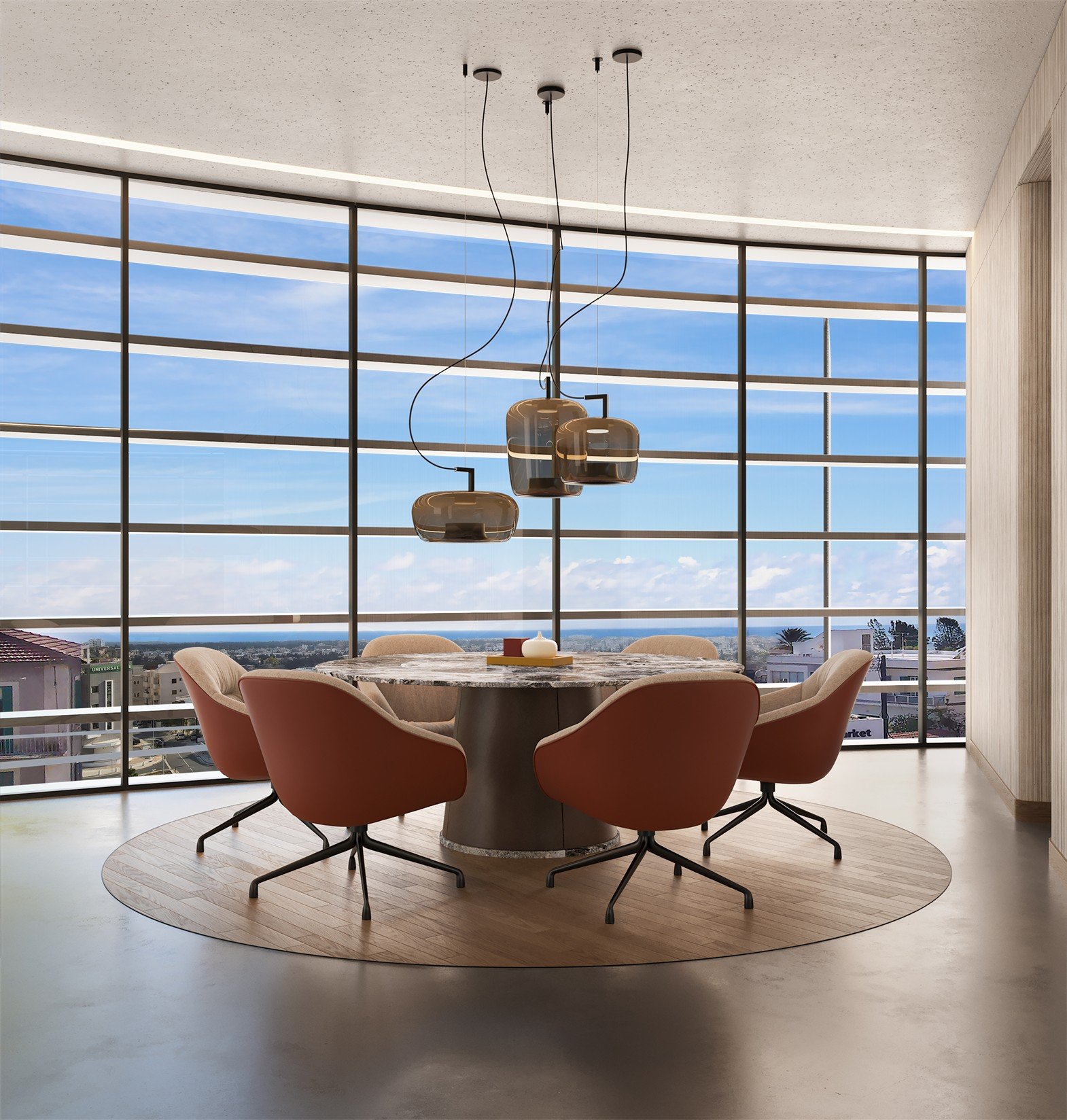 This office space is located in a modern business center in the heart of Paphos. The offices feature large panoramic windows that offer breathtaking sea views, creating an inspiring working environment. The building also includes a restaurant with a daily lunch menu and a SPA center, providing excellent on-site amenities for both employees and visitors.