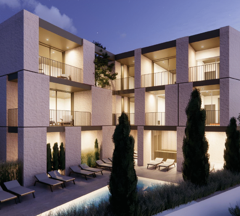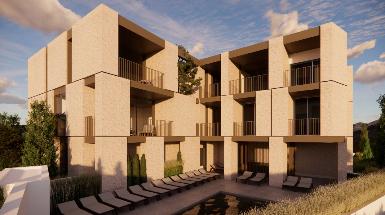 The building consists of three floors and offers a range of properties including studios, 1- and 2-bedroom apartments. Outside the communal swimming pool