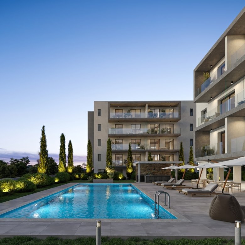 This project is located in the Universal area of Paphos, surrounded by trees, creating a true urban oasis just a 10-minute walk from the sea. The development consists of two buildings with a total of 31 apartments and offers excellent communal facilities, including a large swimming pool, landscaped gardens, lobby areas, and an outdoor snack bar.
