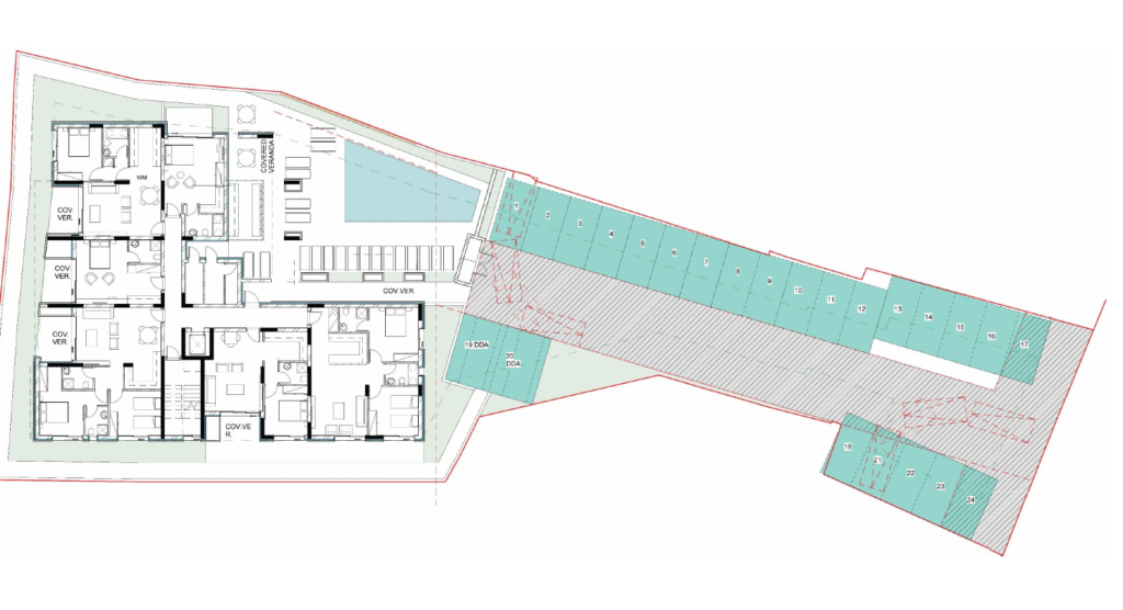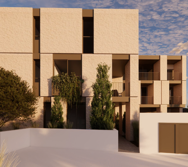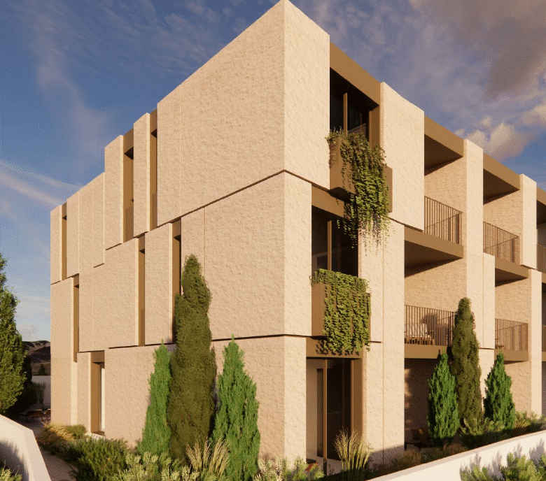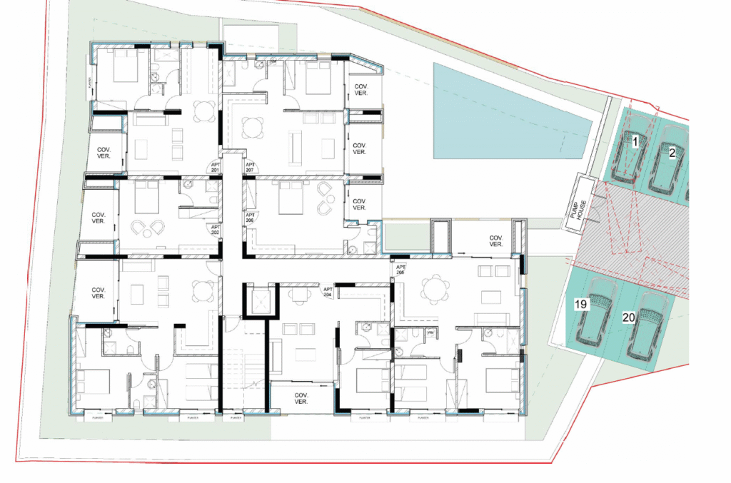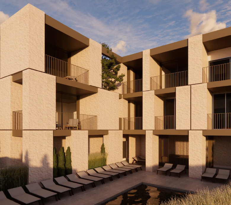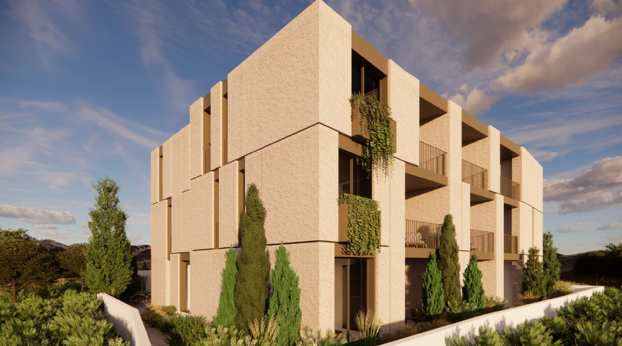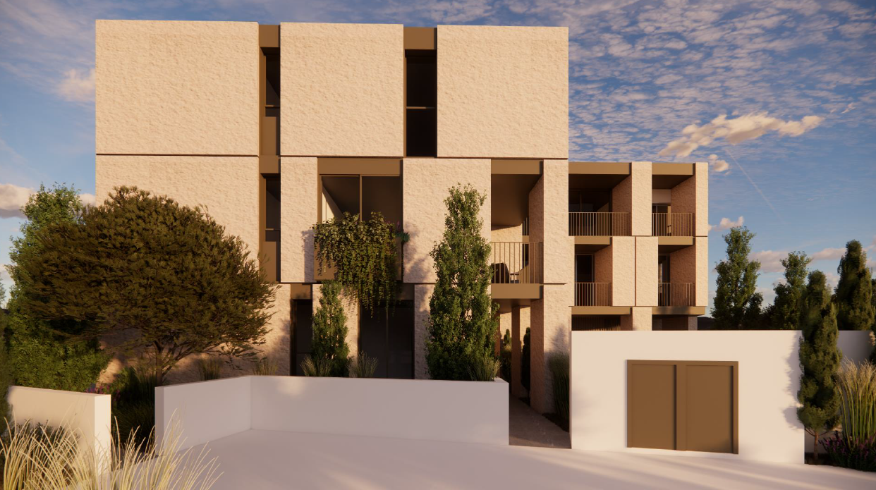 The building consists of three floors and offers a range of properties including studios, 1- and 2-bedroom apartments. Outside the communal swimming pool