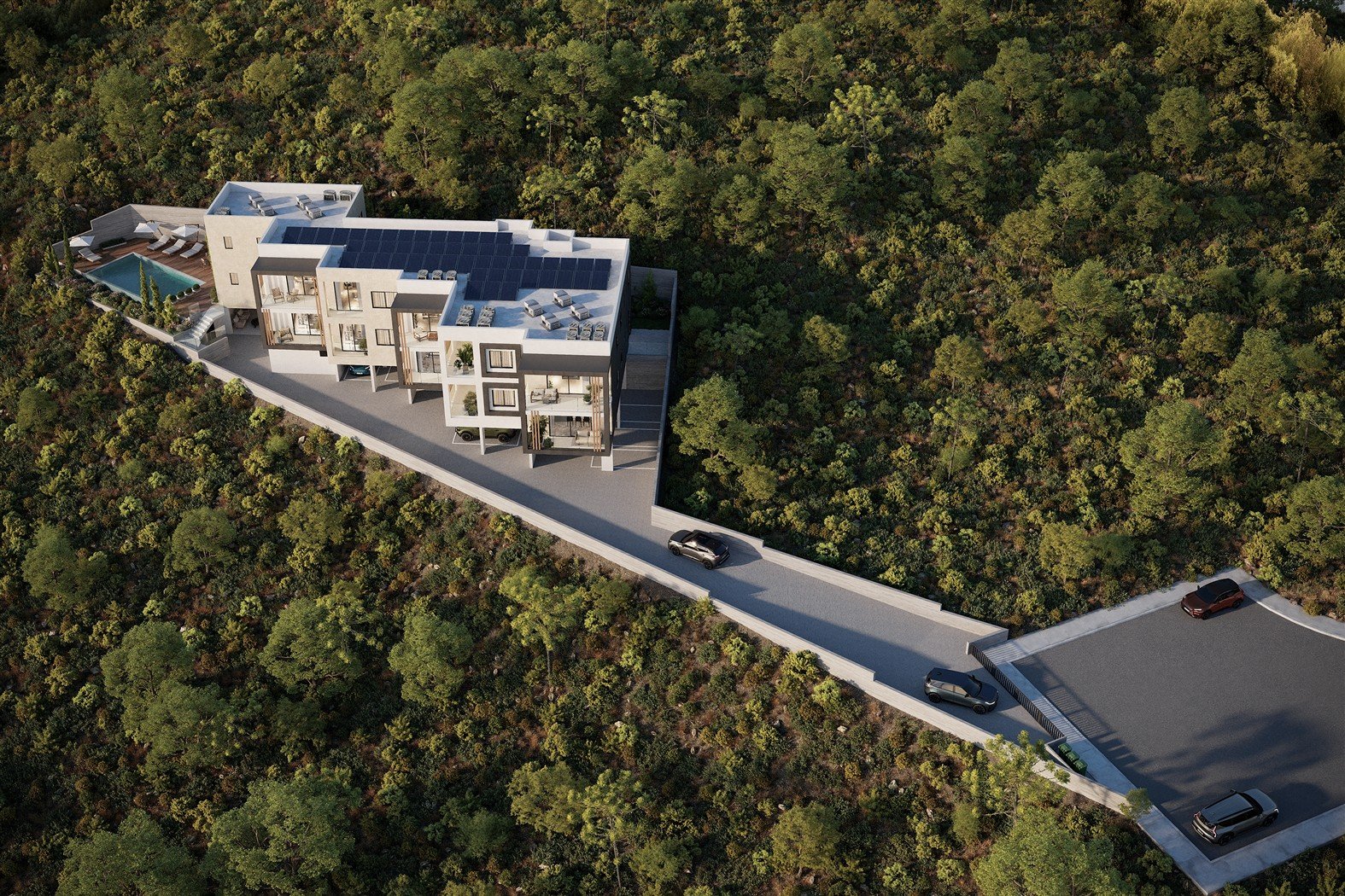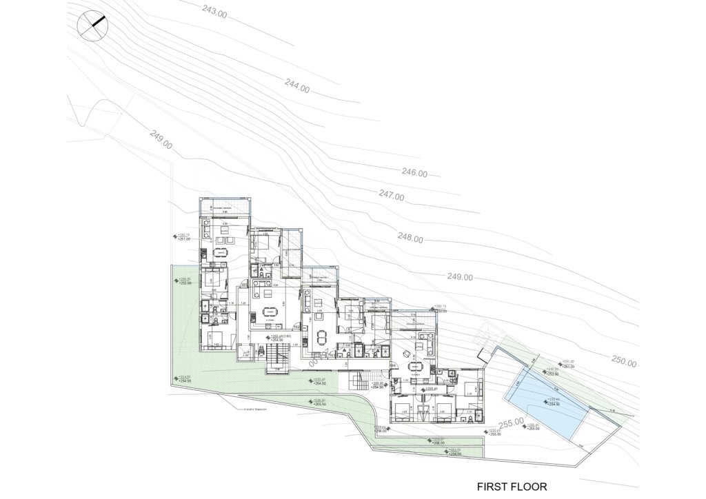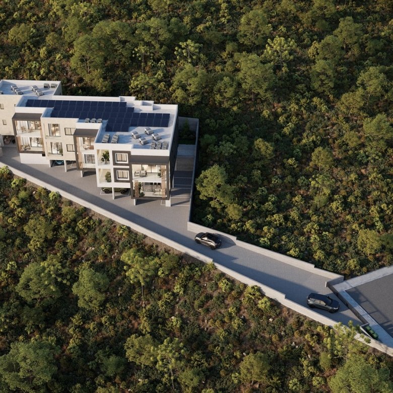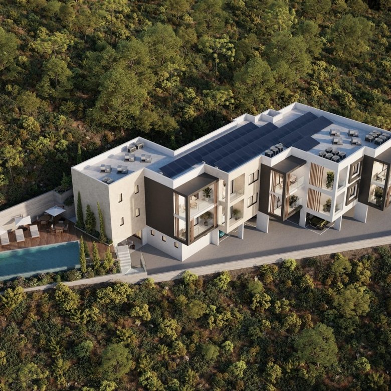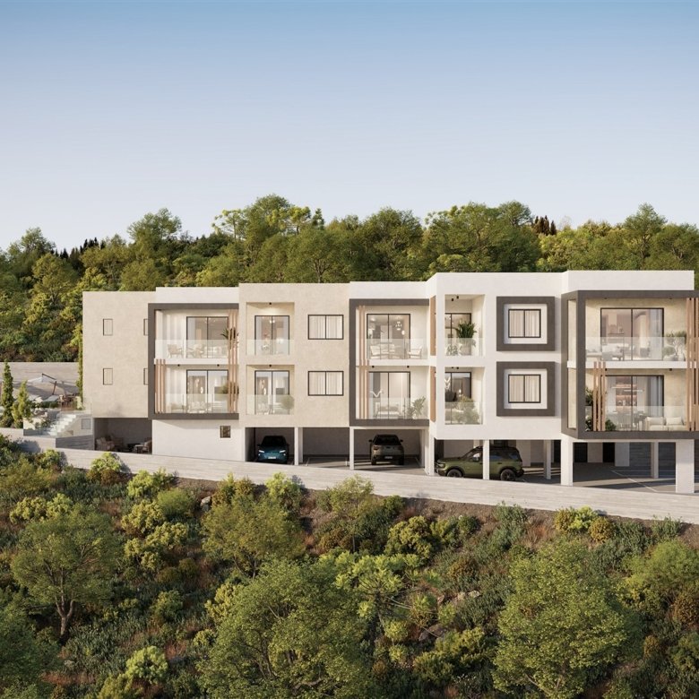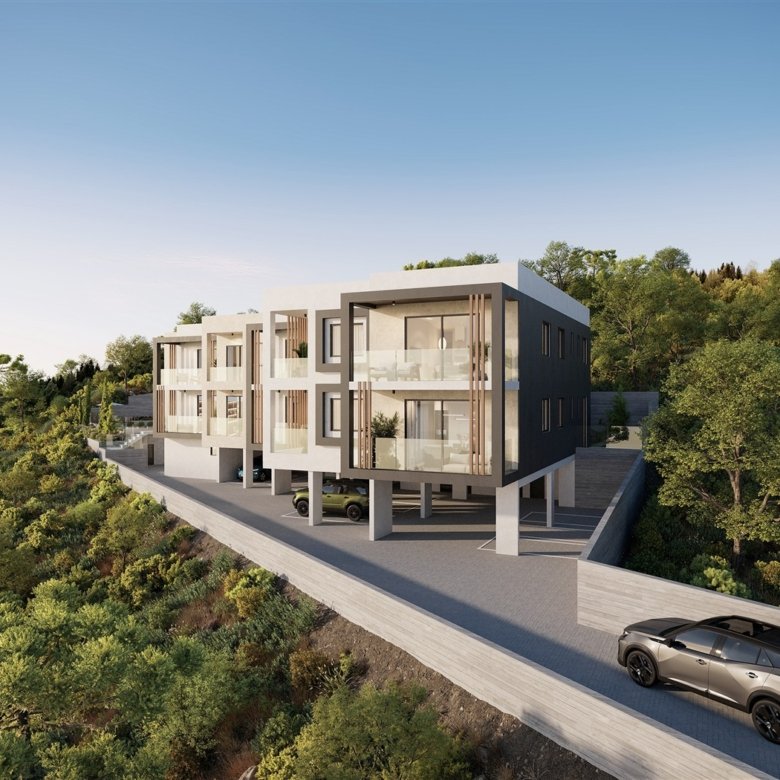 This project is located in Konia Village, Paphos, just 3 km from Paphos town, in peaceful surroundings. The building is a modern development and features a communal swimming pool. The apartment consists of two bedrooms, two bathrooms, and a covered veranda.