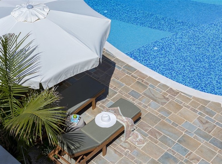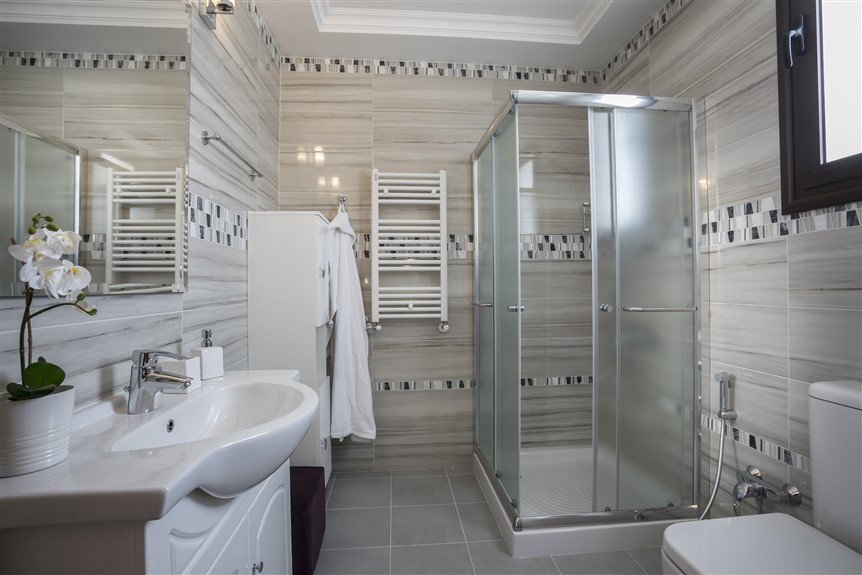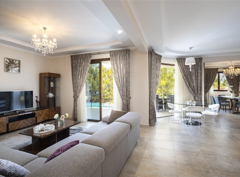 Modern spacious overflow pool with umbrellas and sun loungers, fresh- water shower is the essential part of the villa. Outdoor covered veranda for 8 seats with a barbecue pit is surrounded by the villa garden. The villa is part of the whole project to which a private road leads to. There is direct access to the sea (290 m by walk).
