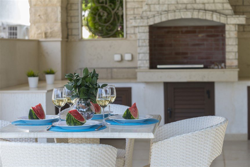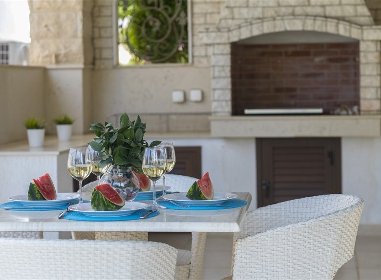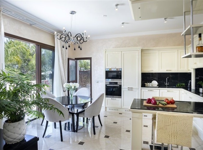 The Italian kitchen of the villa is equipped with high-class German kitchen utensils, glasses, cutlery and various kitchen utensils, the wine refrigerator and modern kitchen appliances.
