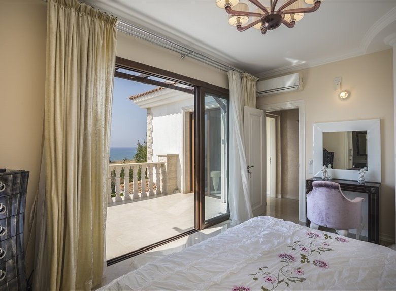 The villa includes 5 bedrooms, two kitchens, 6 bathrooms, sauna and an observation deck on the 3rd floor. On the outside there is a covered outdoor veranda “for barbecue” for 14 seats with its own kitchen, refrigerator and barbecue pit. On the lower level of the villa there is a lower deck with cozy secluded areas next to a waterfall, a bridge, a pond with goldfish and a private access to the sea. It is only 290 meters along a straight path to the seashore. The convenient location combines both the proximity to the sea within walking distance, as well as serenity and peace.
