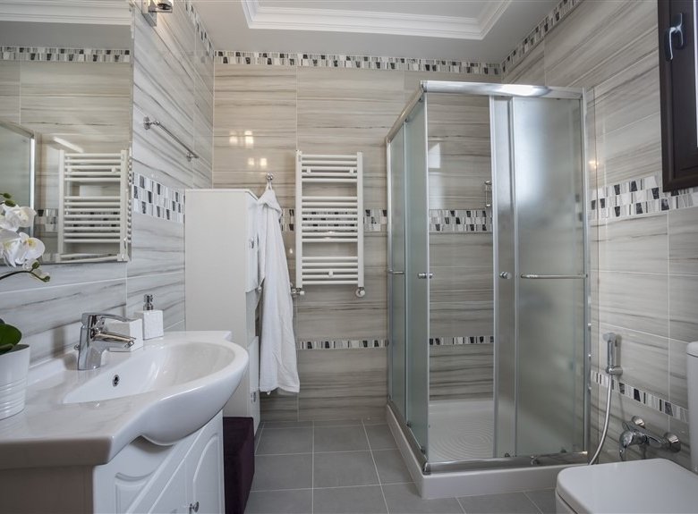 Modern spacious overflow pool with umbrellas and sun loungers, fresh- water shower is the essential part of the villa. Outdoor covered veranda for 8 seats with a barbecue pit is surrounded by the villa garden. The villa is part of the whole project to which a private road leads to. There is direct access to the sea (290 m by walk).