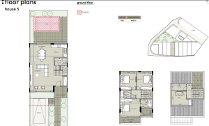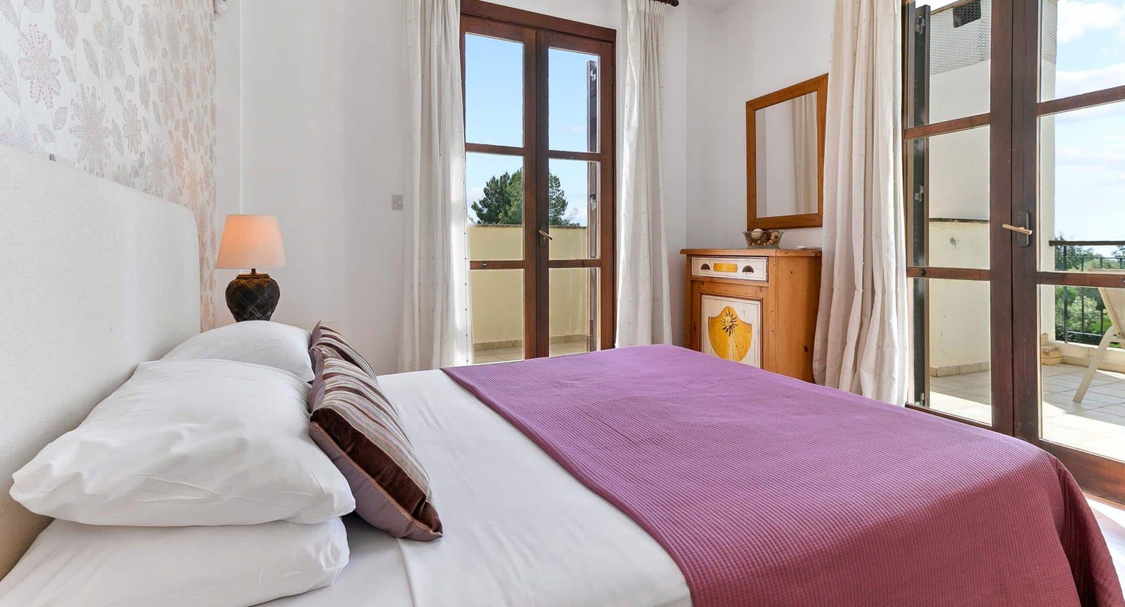 The ground floor includes a twin bedroom with an en-suite bathroom, while upstairs, the master bedroom and an additional double bedroom share a bathroom. Both upper rooms have access to terraces overlooking the golf course, providing ideal views of the sunset.