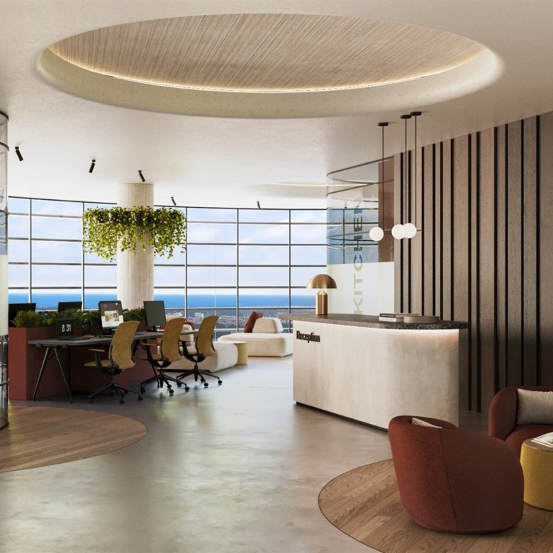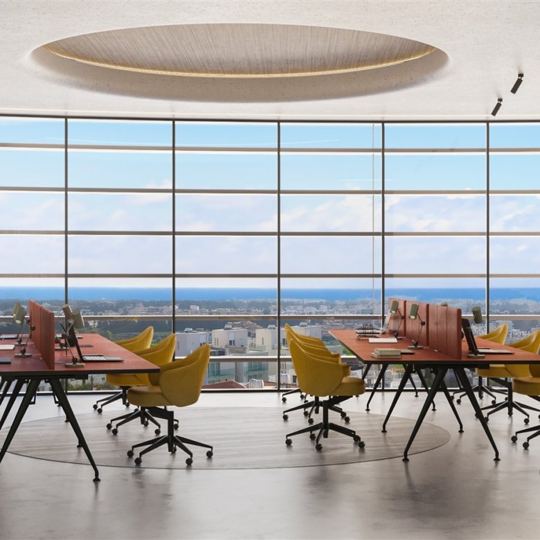 This office space is located in a modern business center in the heart of Paphos. The offices feature large panoramic windows that offer breathtaking sea views, creating an inspiring working environment. The building also includes a restaurant with a daily lunch menu and a SPA center, providing excellent on-site amenities for both employees and visitors.